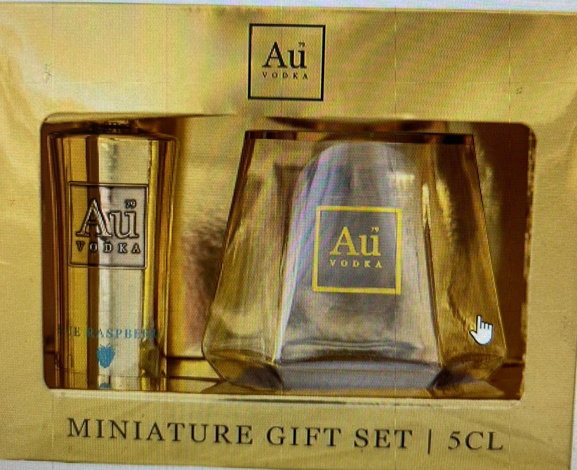 Gift set contains: Au Vodka Blue Raspberry 5cl 1 x l Glass Miniature Gift Set