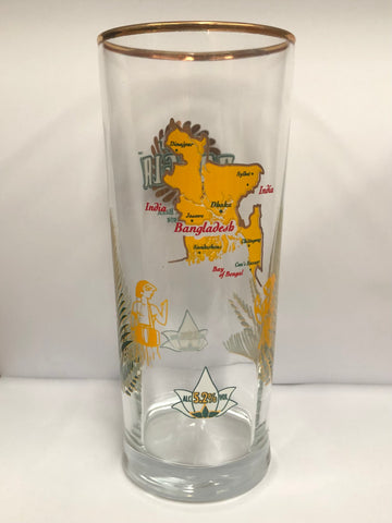 Intricately decorated glass with Bangla on front and map on back, also has ferns and flowers on, gold coloured rim top, lovely shape and feel to glass.
