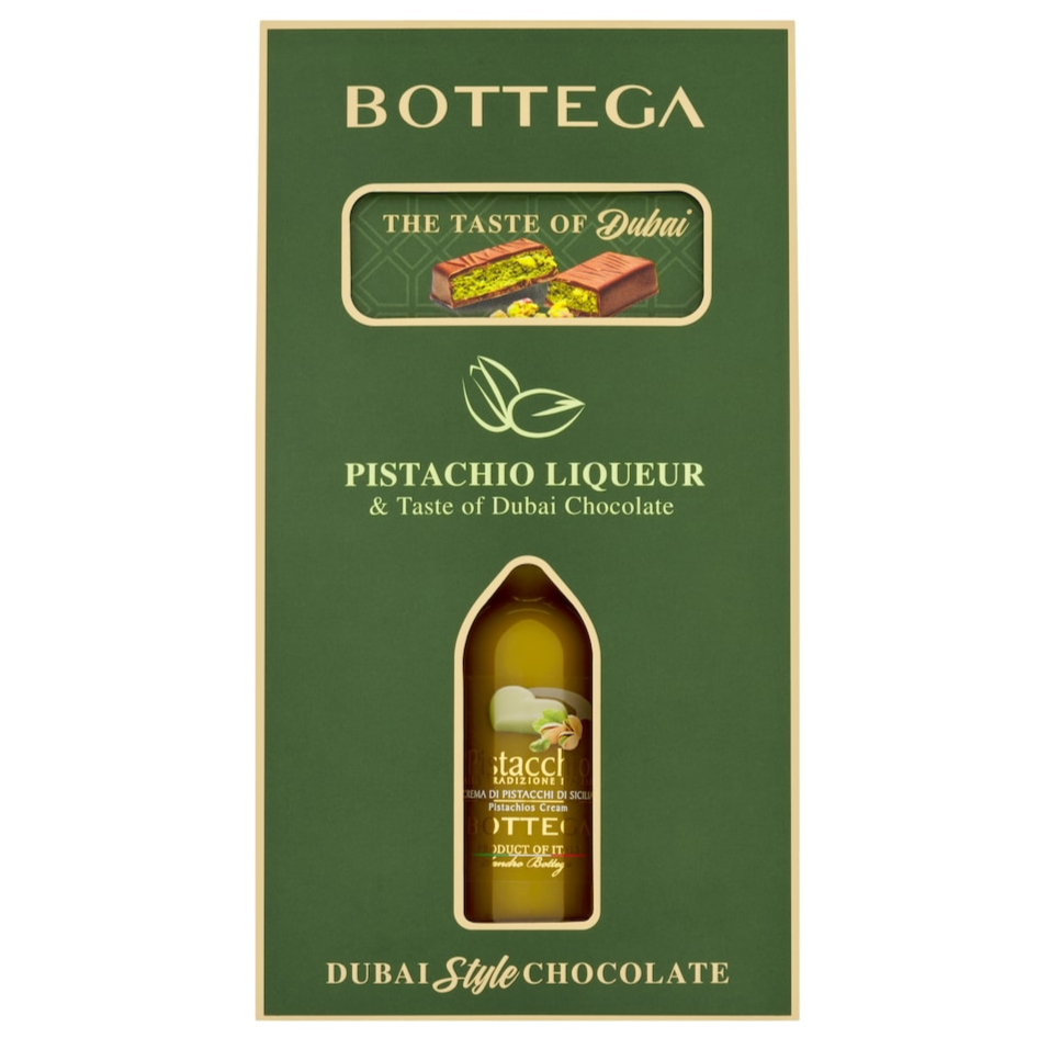 Includes - Bottega Pistachio Liqueur 3cl - ABV 17% Dubai Style Chocolate Bar 30g - Milk Chocolate Filled Pistachio Cream...