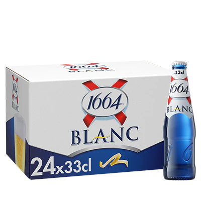 • With a taste as unique as its blue bottle, 1664 Blanc is a premium French beer with a delicate taste of citrus and a beautiful haziness. Crisp, light and refreshing, 1664 Blanc truly delivers good taste with a twist.