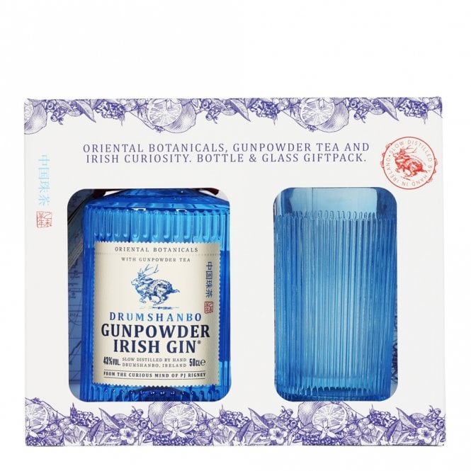 Included in this gift pack we find a bottle of Drumshanbo ‘Gunpowder’ Irish Gin, alongside a matching blue glass, in the same distinctive style. The gin has been crafted using gunpowder tea, along with a range of other exotic botanicals from the Orient.