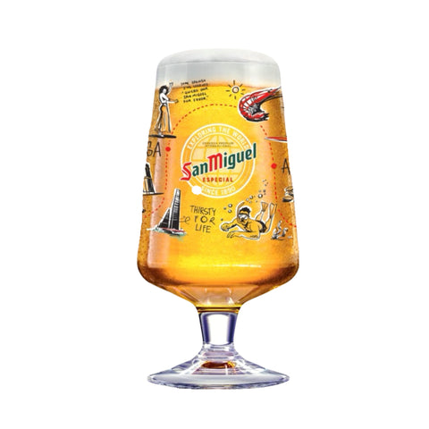 San Miguel is a lager with Spanish heritage but originally produced from Manilla, Philippines. With this official San Miguel chalice beer glass you can indulge yourself in a little taste of Spain.