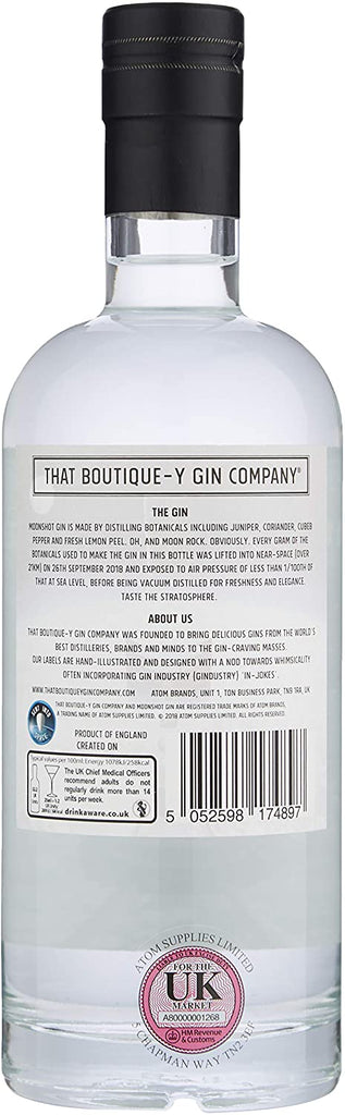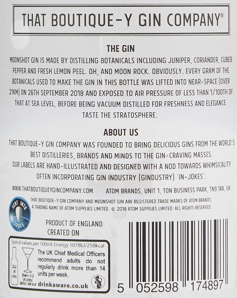 Juniper, Coriander, Camomile Flowers, Fresh Lemon Peel, Cardamom, Dried Bitter Orange Peel, Cinnamon, Cubeb Pepper, Liquorice Root and Angelica were used. Oh, and Moon Rock. Obviously. Once they returned to earth, we vacuum distilled them at room temperature (at a pressure nearer 1/10th of that at sea level, in case you were wondering) for freshness and elegance.